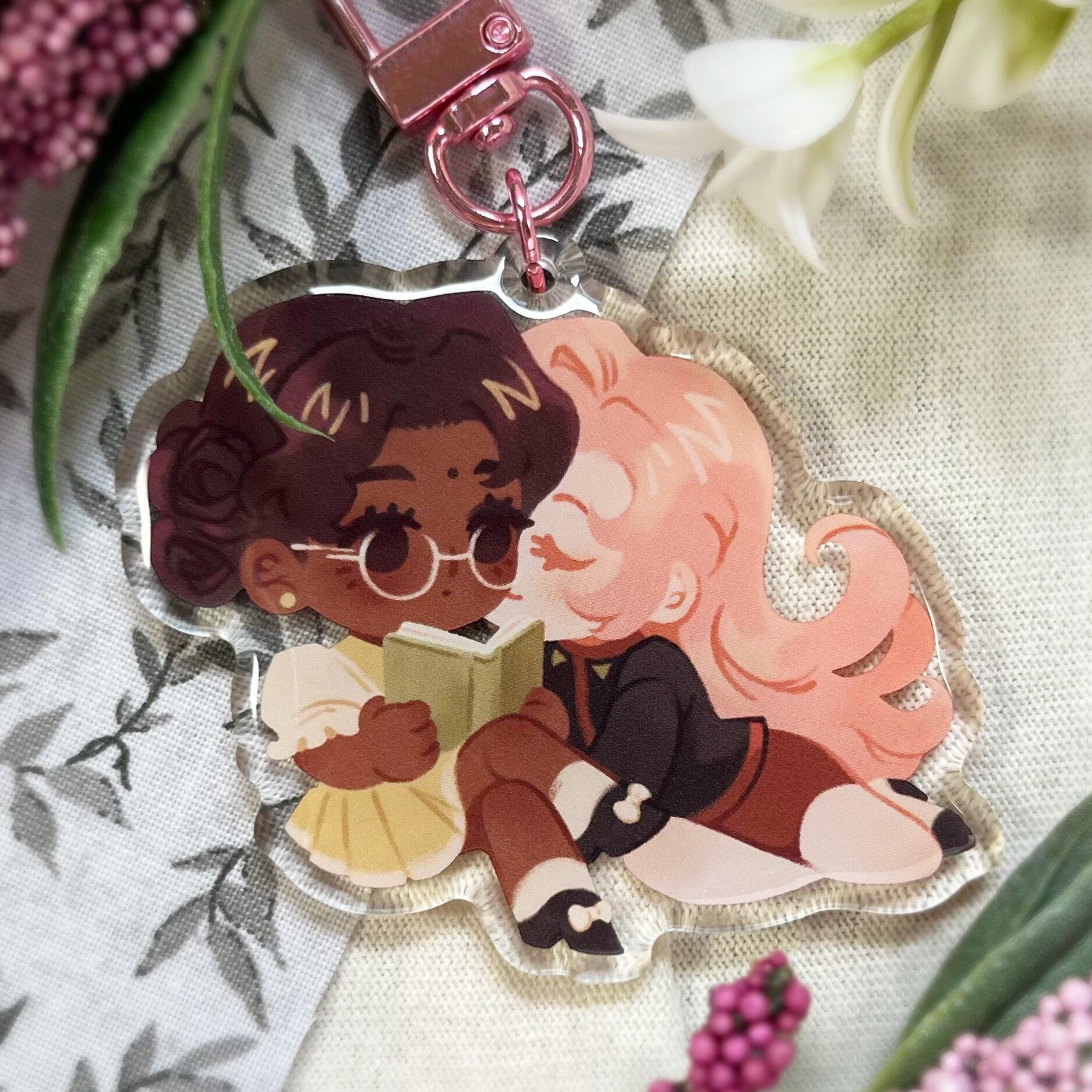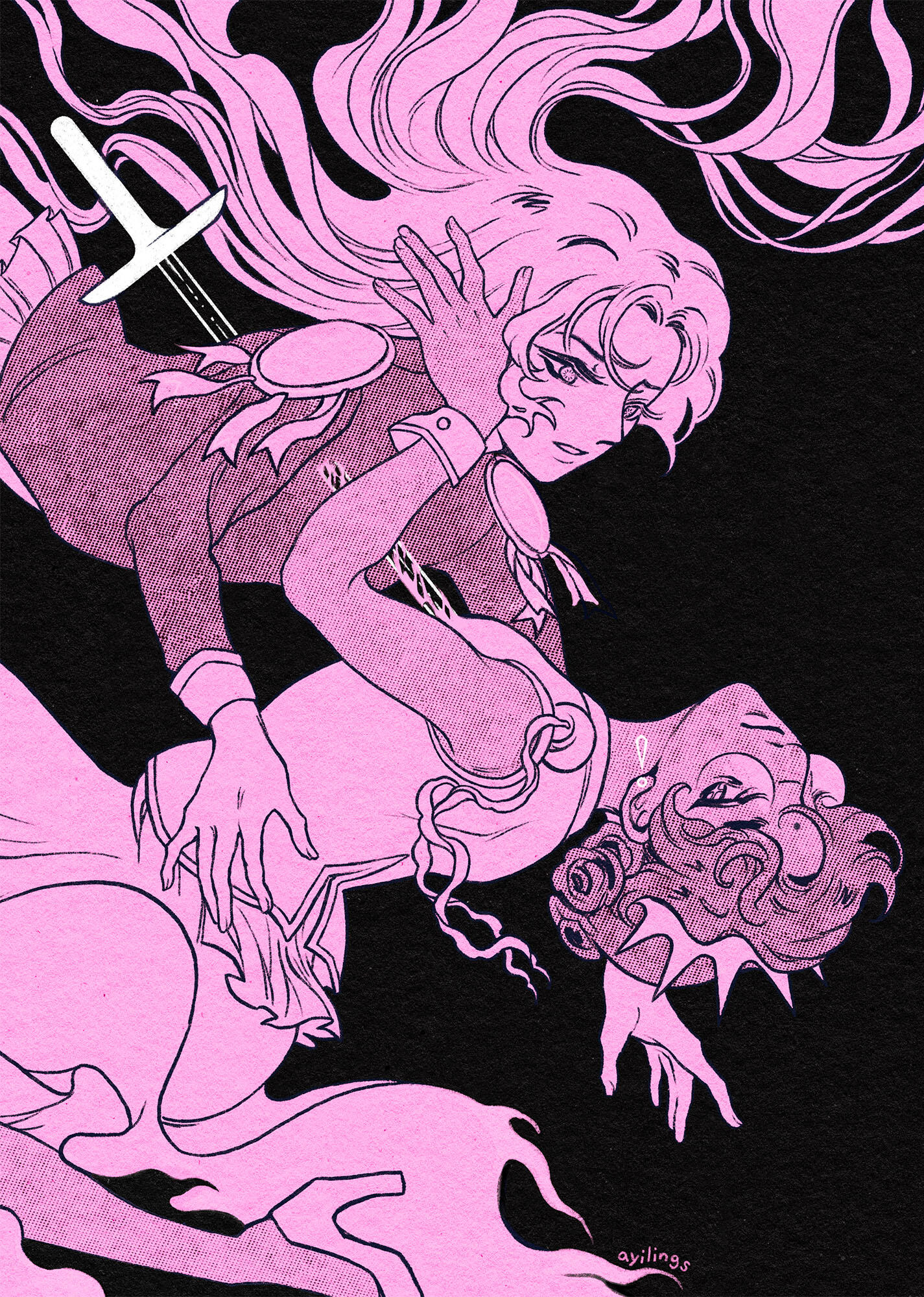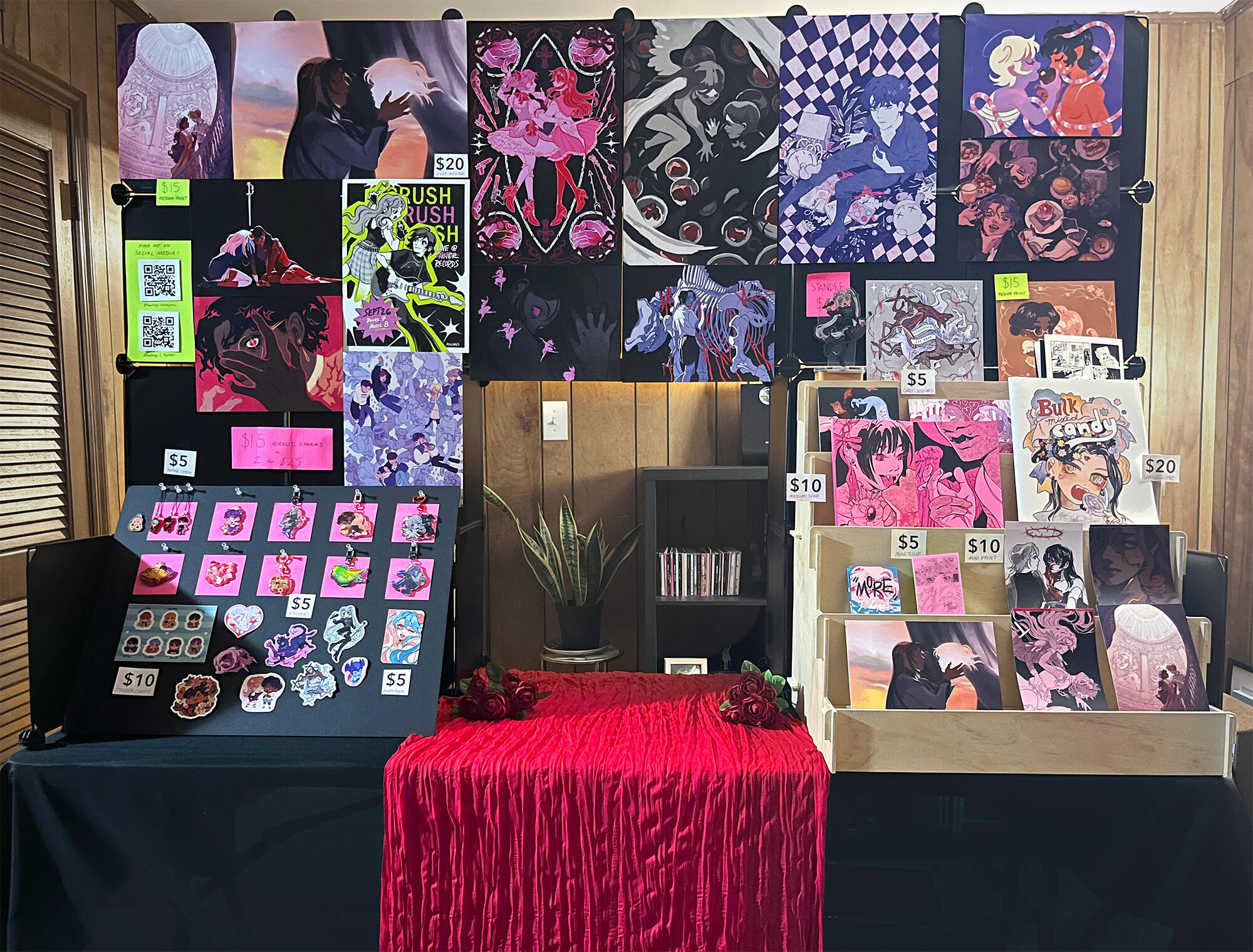 Hi, I'm Ann! I'm an illustrator and cartoonist. My work focuses on queer narratives, often inspired by classic shoujo and yuri stories. I also draw creatures and love creepy-cute horror imagery!My artist alley offerings include prints, comic zines, and merchandise like charms and stickers.
